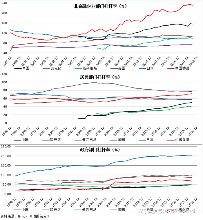 中国香港与中国大陆的企业部门杠杆率目前分别以230.60%和155.10%分别居于主要经济体中的最高位,美国与日本则分别稳定在75%和100%附近。2007-2008年金融危机以来,发达经济体纷纷降低居民部门的杠杆率水平,使其从相对高位回落,但中国等新兴市场经济体的居民杠杆却开始逐步攀升,近十年来上升幅度最大,已由2008年的20%以下升至目前的50%附近。就政府部门杠杆率而言,日本一骑绝尘,高达200%以上,而发达经济体普遍较高,新兴市场经济体则普遍较低。