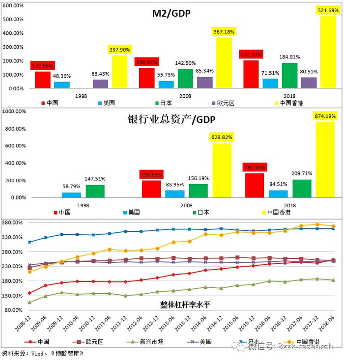 从1998年、2008年与2018年三个时间点来看,中国大陆的M2/GDP分别为122.66%、148.84%和202.90%,中国香港则分别为237.90%、367.18%和521.69%,在主要经济体中处于明显高位,远远高于美国与欧元区不足100%的水平。