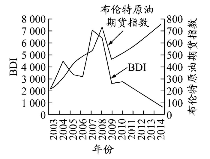【图12】2003—2014年世界原油价格与BDI比较【来源:《国际干散货航运市场影响因素及规律》】