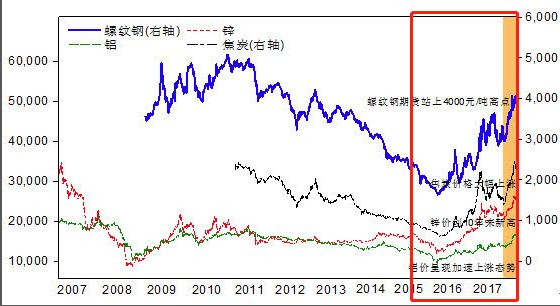 让我们回到2017年三季度:当时国内煤焦钢等黑色系列商品、铜铝锌等有色金属品种、塑料等能化商品强势反弹。其中,螺纹钢、热轧等钢材价格在8月末更是呈现出加速上涨态势,华南地区螺纹钢现货价格一度超过4600元/吨,直逼6年前的高点。与现货市场相呼应,国内黑色商品期货价格也大幅大涨。