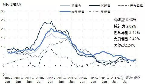 近十年来,国际干散货航运市场总运力呈线性增长趋势:截至2018年12月初,全球干散货船运运力达11337艘,8.39亿载重吨。其中海岬型船运力达1726艘,3346万载重吨;巴拿马型船运力2566艘,2065万载重吨;大灵便型船运力3622艘,2005万载重吨;灵便型船运力3423艘,981万载重吨。国际干散货船总运力增速达2.82%,海岬型船舶运力增长步伐加快,增速达3.43%。