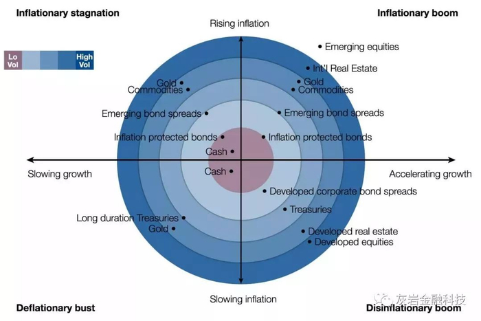 让我们从为什么它是直观的开始。 从桥水Bridgewater Associates一家管理1500亿美元客户资产的投资公司的一份报告,生动地描述了其创始人Ray Dalio在制定全天候投资策略时如何“奠定风险平衡的基础”。 全天候的想法很简单:不同的经济方案在整个商业周期中对不同的资产类别构成风险。 Dalio和他的团队确定了四个主要的风险情景,并确保至少有一部分投资组合能够承受每个风险。 因此,这就是全天候与风险平价相似的地方:两种策略都不是在传统的投资组合优化设置中瞄准最优风险和回报,而是努力实现所有资产类别的均衡风险贡献。