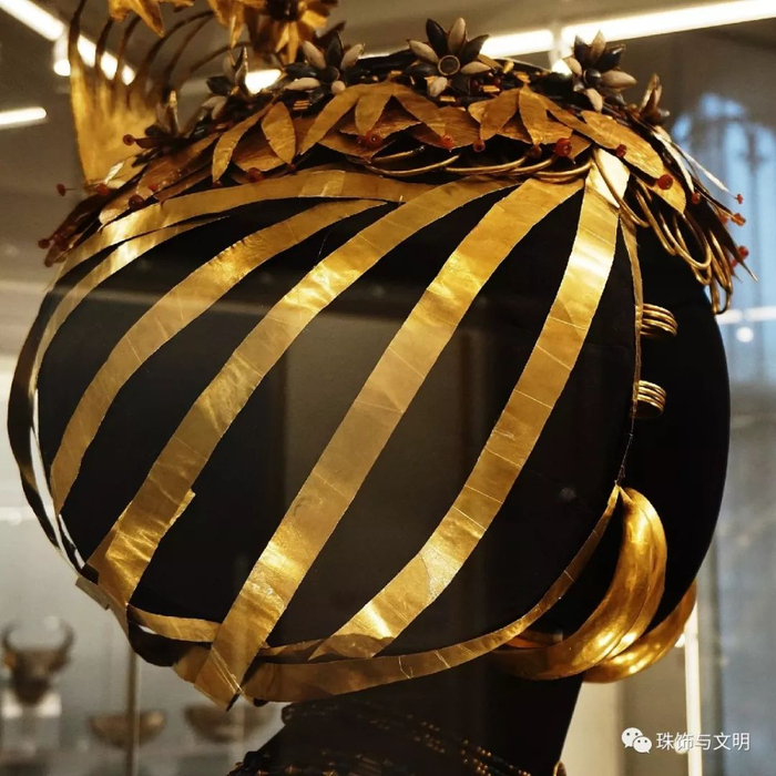 乌尔王陵的苏美尔黄金宝藏中,最著名的是出土于普比(Puabi)王后墓(编号PG800)的黄金珠宝,距今约4500年。从复原的装束看,普比王后头上戴黄金叶子、金花、金带、金环、金发簪、金发圈组成的黄金桂冠,耳朵上坠着弯月形黄金耳饰。