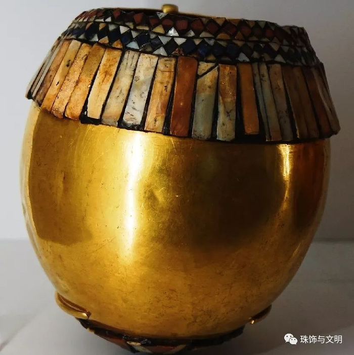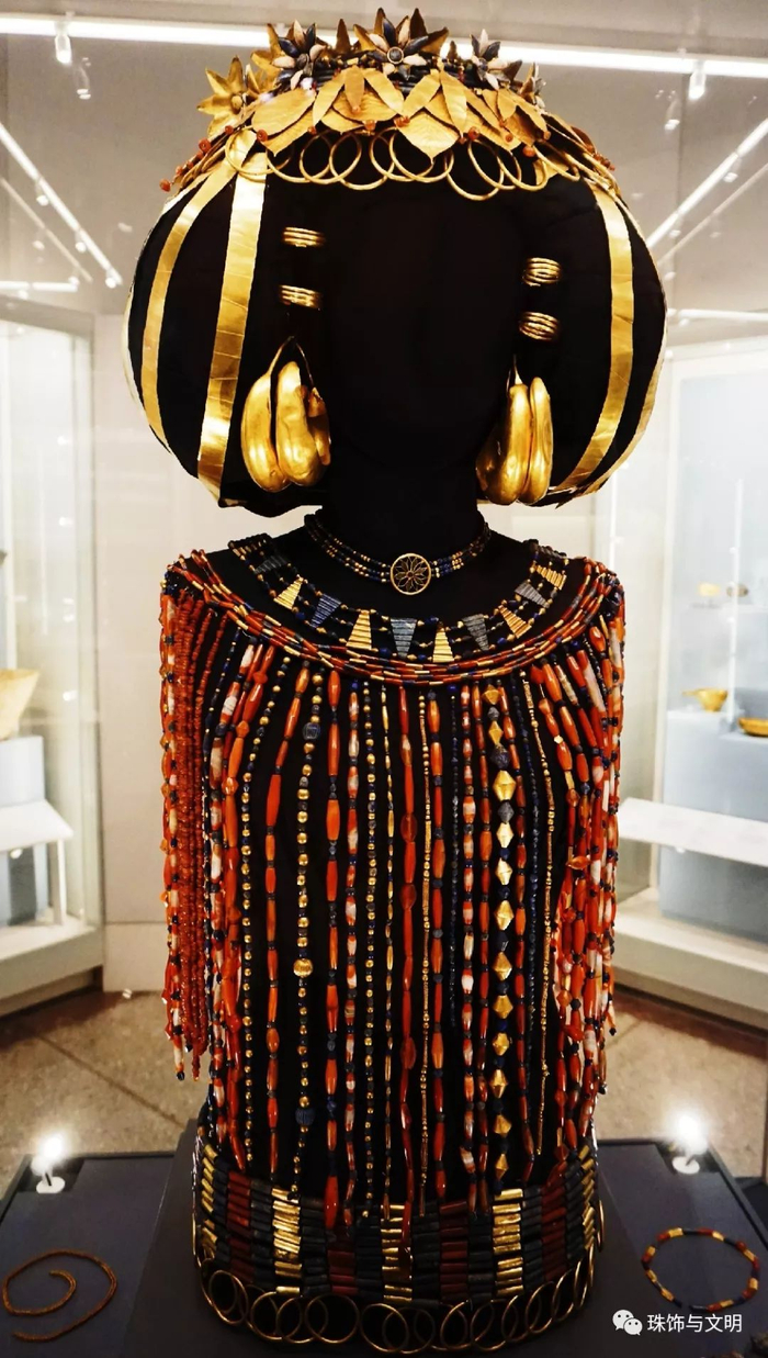 普比王后的脖子和身上披挂着黄金、红玛瑙和青金石珠饰组成的奢华珠衣。王后的手上戴满了金戒指。普比王后的墓葬还出土了各种黄金器皿(10,11)。