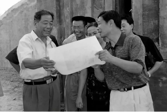 1992年,王乐义(左)和技术人员探讨大棚改良方案