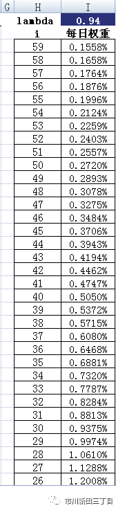 原则是离当前最近交易日的价格波幅被赋予的权重最高,离当前日期越远的交易日的波幅的权重越小。具体做法是引入一个叫做Lambda (λ)的因子,每天的权重=(1- λ)λ0,λ必须小于1,一般被设定为94%。离当前最近交易日的价格波幅的权重为(1-0.94) = 6%,前一交易日的价格波幅的权重为6%*0.94 = 5.64%,以此类推,比如用于计算移动平均值的天数为60天,每日权重如下: