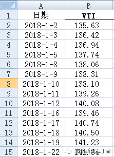 从Yahoo.com网站下载交易所交易基金VTI自2018-1-2至2019-2-28的报价,只留下经调整后的收盘价。