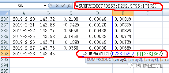 选定Excel的单元格E252,用函数sumproduct()计算每日权重乘以日价格涨跌幅的平方的结果。以最新的交易日2019-2-28为例,()内为离2019-2-28最近的60个交易日的波幅分别乘以60日的权重,权重和交易日的波幅均为由远及近的顺序排列,数值取值区间为D233:D292,每日权重所在的单元格为J3:J62,作为公式需要锁定,并顺次向上拷贝到各个单元格直到2018-3-29所在的E62。