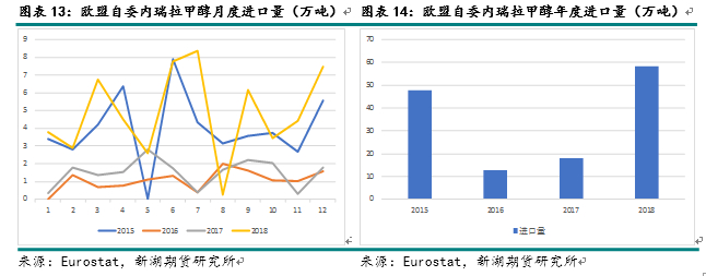 历史上委内瑞拉甲醇主要向美国和欧洲地区出口。委内瑞拉三套装置年产能约230万吨,按2018年约66%的全年平均开工计算,全年产量在150万吨左右,其中约50万吨出口至美国,约58万吨出口至欧洲地区,流向欧美地区的甲醇占到委内瑞拉供应规模的70%。