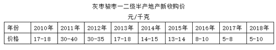 新疆2010年开始成为全国红枣最大产区,2010-2012是红枣行情最好的年份,普通地区枣农出售红枣价格最高达50元/千克,和田、羌无等地区售价高于50元/千克。随着红枣行情的提升以及利润的引诱,红枣种植面积不断扩大,产量出现大幅增加,价格出现走弱,从2013年开始呈下滑趋势。2013年枣农红枣出售价格为 17-18元/千克,2016年价格下降为5-8元/千克。