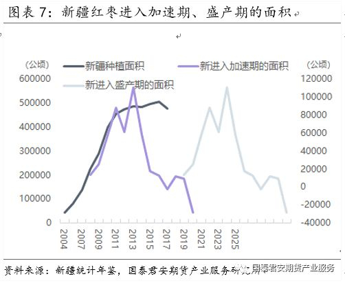红枣的经济寿命大约60~80年,树体寿命长达200~300年以上。一般4年后结果量逐年增加,15年后进入盛花期,盛花期能持续50-60年。新疆红枣基本上从2004-2005年才开始扩种的,持续扩种至2015年,随后新疆种植面积小幅波动。据2019年4月份调研资讯显示,新疆受到退耕还林政策限制,砍树现象不多,其他因素正常情况下,后续会有更多的新疆红枣进入盛产期,保守估计2019年红枣产量仍将呈现易增难减格局。不过需要注意的是,由于新疆缺水,人工管理很重要,若连续2年无人管理,枣树树根会受旱而死。