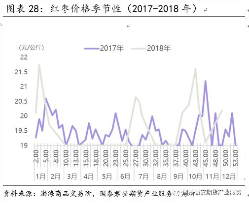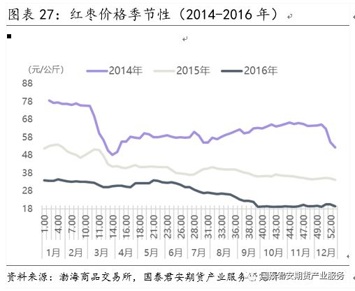 红枣价格体现为明显的季节性:冬(腊八节制粥)春(春节做枣糕)为旺季,夏秋为淡季。