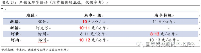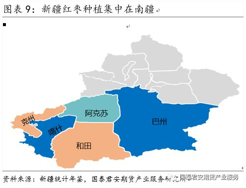 红枣产区看新疆,销区市场主要看河北沧州崔尔镇和河南新郑孟庄镇。一般每年10-12月份产销区相关度较强,随后区域相关性减弱,价格主要跟当地的供需、库存及周转速度等因素相关。