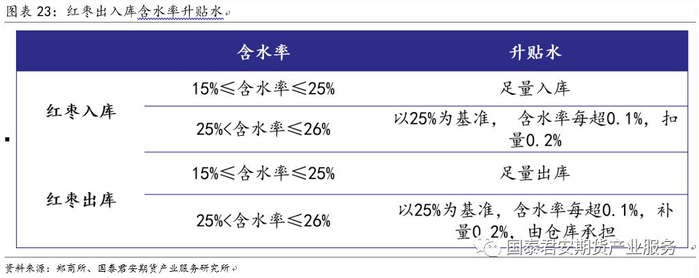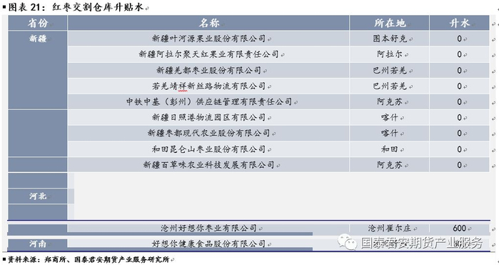 经过相关数据测算、调研数据佐证,预计交割品级成本在10000元/吨左右。目前新疆至内地的运费在600-700元/吨附近,内地交割库升水600元/吨,出库费用50元/吨,按照红枣期货基准价8600元/吨计算的基准交割品的接货成本是9250-9350元/吨附近。达到期货基准交割品标准及以上的红枣或占新疆原枣的35%,约96万吨。