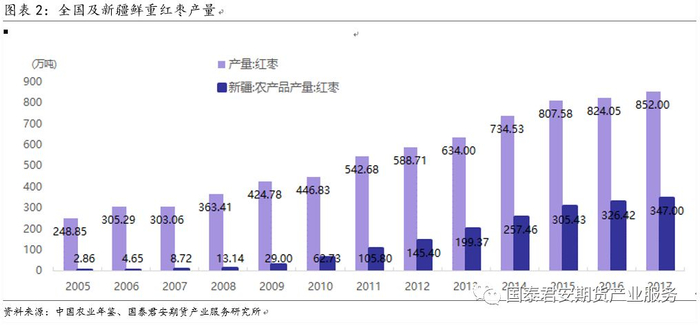 中国是世界上最大的枣树种植国、消费国和唯一的枣产品出口国,红枣产量占全球95%以上,进出口量极少,红枣是中国的特色果品。红枣期货的交割品为干制红枣。我国林业统计年鉴数据显示,2017年中国干制红枣产量为562万吨,占全球比例为98%。中国农业年鉴数据显示,2017年中国红枣鲜重产量852万吨,占全球比例为97.2%。