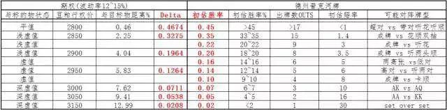 那么从盖率小的对阵牌型依序到盖率大的牌型,落后手牌翻盘的胜率由低到高的排列,刚好跟期权中深度虚值合约一直到浅虚值合约再到平值合约依序的牌列中,delta由小到大的数值呈现很接近。