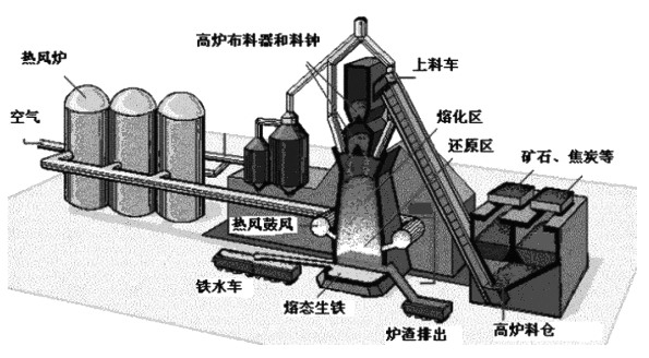 高炉生产镍铁的流程主要是矿石干燥筛分(大块破碎)—配料—烧结—烧结矿加焦炭块及熔剂(英石)入高炉熔炼—镍铁水铸锭和熔渣水淬—产出镍铁锭和水淬渣。