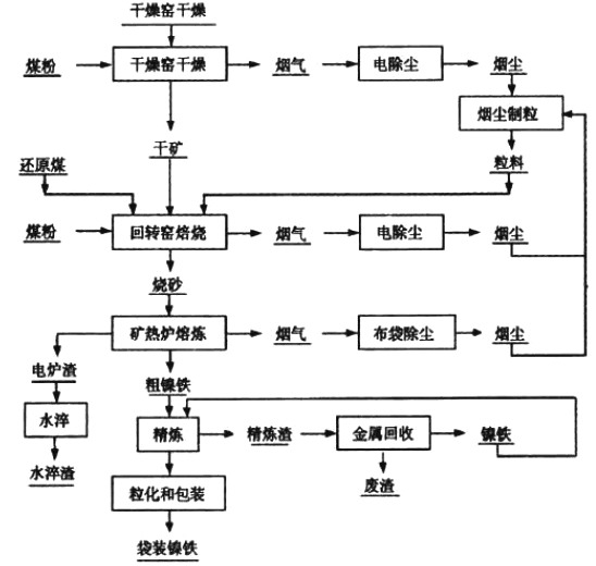 回转窑-电炉法还原工艺是国内较为常用的一种火法冶炼工艺,流程简单分为以下几个工序;干燥焙烧,矿石在直径3m、长80m的回转窑内,用热煤气加热至650℃—700℃,去除全部附着水和60%—70%的结合水;熔炼还原,热矿石在电炉内熔化成矿熔体,随后还原分开粗镍铁和铁渣;精炼,一般采用钢包精炼,脱硫、磷。