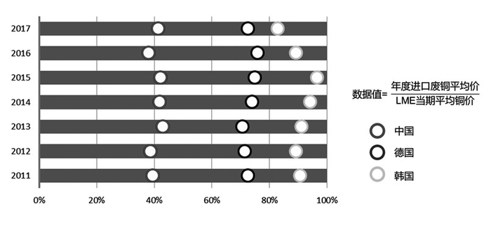 CMRA通过对比前三大废铜进口国的进口废铜价格,发现虽然我国进口金额最高,但其中含铜比例是最低的,仅为40%左右;德国次之,约为70%;韩国的进口含铜量最高,达到90%左右。