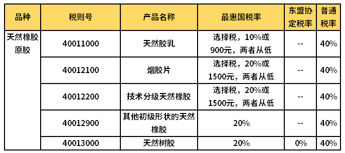 表2:天然橡胶及相关产品进口关税表(2019年)