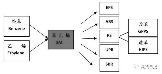 苯乙烯是一种重要的液体化工原料,属于带有烯烃侧链并与苯环形成共轭体系的单环芳烃,是不饱和芳烃中最简单、最重要的成员。苯乙烯被广泛用作生产合成树脂和合成橡胶的原料。苯乙烯“上承油煤、下接橡塑”,是一种重要的石油化工基础有机原料。苯乙烯的直接上游是苯和乙烯,下游比较分散,涉及的主要产品为发泡聚苯乙烯、聚苯乙烯、ABS树脂、合成橡胶、不饱和聚酯树脂以及苯乙烯类共聚物,终端主要应用于塑料和合成橡胶制品。