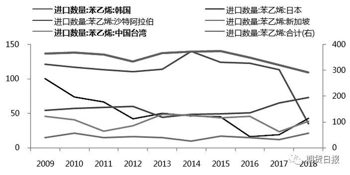 随着国内新增产能的增加,近几年中国苯乙烯进口量和进口依存度稳步下降。根据海关数据,2018年中国苯乙烯主要进口国家依次是沙特、日本、韩国、新加坡等;2017年之前苯乙烯进口主要的来源国为韩国、沙特和美国,其中韩国是最大的进口来源国。2018年6月23日起,中国商务部对原产于韩国和美国的进口苯乙烯征收3.8%—55.7%不等的反倾销税,征收期限为5年,导致2018年下半年中国从韩国进口的比重大幅下降,沙特、日本成为主要进口来源国。