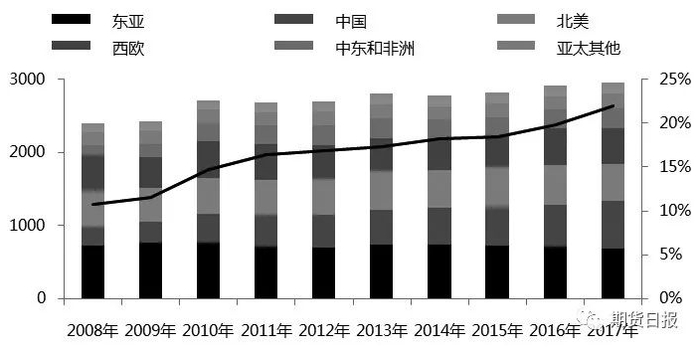 全球纯苯产量主要集中在东亚、北美及亚太其他地区,这几个地区的纯苯产量占全球总产量的78.7%。另外,亚太地区纯苯产量占全球总产量的62.4%。从全球纯苯贸易流向来看,东亚及亚太其他地区是主要出口地,中国和北美是主要进口地,其中中国的纯苯进口呈逐年增加趋势,北美地区2017年进口大幅下降。