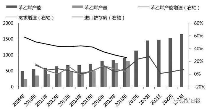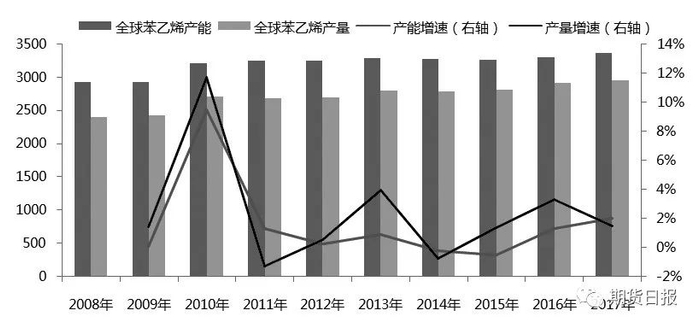 图为全球苯乙烯产能产量及增速(单位:万吨,%)
