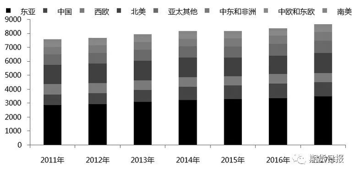 图为全球苯乙烯产量分布趋势(单位:万吨)