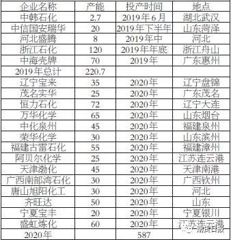 表为2019—2020年中国苯乙烯新增产能情况(单位:万吨/年)