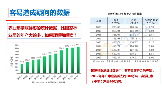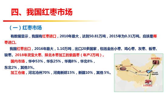 李新岗指出,有数据显示,我国有红枣进口,2010年最大,达到50.81万吨,2015年为0.31万吨。应该是椰枣进口。