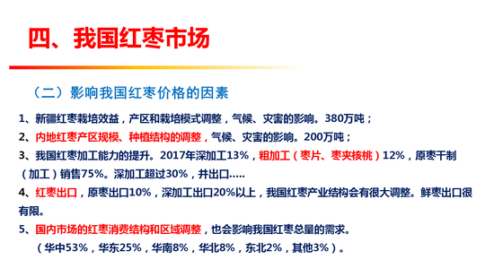 3、我国红枣加工能力的提升。2017年深加工13%,粗加工(枣片、枣夹核桃)12%,原枣干制(加工)销售75%。深加工超过30%,并出口…