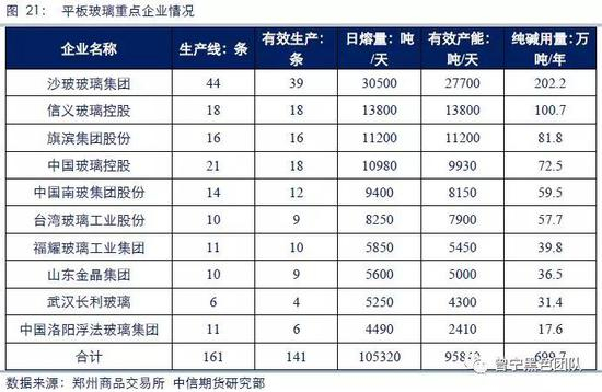 平板玻璃重点生产企业10家,合计生产线161条,有效生产线141条,开工率87.6%,高于全国平均开工率24个百分点;总产能105320吨/天,有效产能95840吨/天,纯碱年用量699.7万吨,占全行业的62.6%,集中度相对较高。