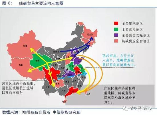 纯碱的贸易流向:华南、华北和华东是纯碱贸易较为集中的地区。华南作为纯碱的主销区之一,区域内供给不足,市场缺口由华北、华东、华中及西部区域补给。