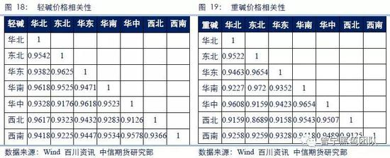 我国各区域纯碱市场价格联动性很强。2013年10月至2018年12月,华北、东北、华东、华南、华中、西北、西南地区7665个纯碱价格数据的相关系数统计结果显示,各地区之间的纯碱价格高度正相关,不同地区轻碱相关系数均值为0.9436,重碱相关系数均值为0.9367。