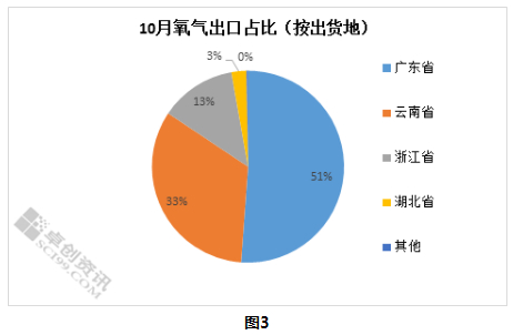 从海关数据(按发货地)看,10月我国氧气主要出口地有7个,其中广东出口总量占比在51%;云南出口量占比在33%;浙江出口量占比13%。其他地区出口较少,为别为湖北、上海、福建等地。