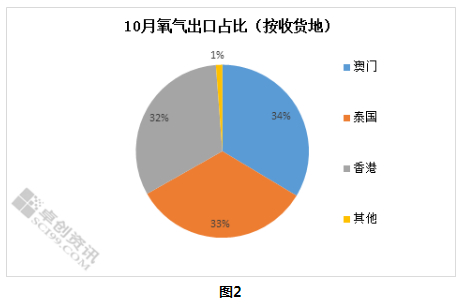 从海关数据(按收货地)看,10月份我国氧气出口到多个国家和地区,中国澳门进口7.5万立方米,位居第一,占比为34%;泰国进口7.45万立方米,占比为33%,占比第二。香港进口7.2万立方米,占比31%。其他地区进口较少。