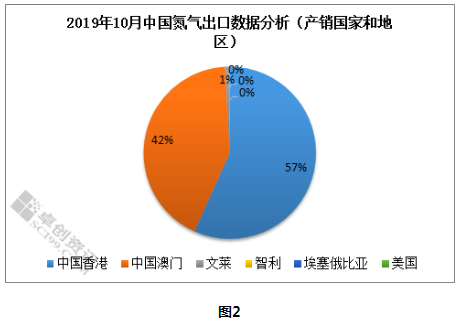按产销国家和地区,2019年10月中国氮气主要出口至中国香港,占比57%,总量106325立方米,环比9月增加12.55%。其次是中国澳门,总量79277立方米,占比42%,环比9月减少1.95%。除此之外,还有少量出口至文莱、智利、埃塞俄比亚以及美国。
