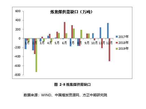 从供需平衡表可以看到,2019年5月份开始,炼焦煤已经供过于求,与上文提到的总库存开始增加时间上基本吻合。由于需求回落,预计2019年四季度仍将出现累库。