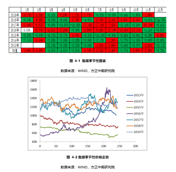 相比于焦煤,焦炭季节性走势更不明显。焦炭自2011年3月份上移以来,近9年统计数据看出,焦炭上次概况超过50%月份为1月、2月、7月和10月,其中1月份和2月份焦炭上涨概率最高,在统计的8次中出现5次上涨,上涨概率为62.5%。7月份和10月份焦炭上涨概率为55.56%。焦炭下跌概率超过50%的月份为3月、4月、5月、6月、8月、9月、11月、12月。3月份焦炭下跌概率最高,从2012年-2019年仅2016年三月份出现上涨,其余年份全线下跌,下跌概率87.5%。9月份下跌概率次之,在统计的9次中,9月份上涨年份仅2012年和2016年,其余年份均下跌。下跌概率为77.78%。“金三”和“金九”两个旺季但在焦炭上表现并不明显。