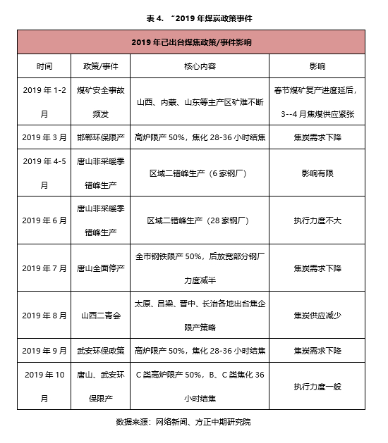根据《 京津冀及周边地区2019-2020年秋冬季大气污染综合治理攻坚行动方案 》,2019年12月底前,河北省压减退出焦炭产能300万吨,山西省关停淘汰焦炭产能1000万吨,山东省压减焦化产能1031万吨。河北、山西、山东加快推进炉龄较长、炉况较差的炭化室高度4.3米焦炉压减工作。河北、山东、河南要按照2020年12月底前炼焦产能与钢铁产能比达到0.4左右的目标,加大独立焦化企业压减力度。从文件统计的数据看,若完全执行,2019年焦化产能要压减2331万吨。根据Mysteel统计的数据,2019年截至10月底,目前已淘汰581万吨,而新增产能1415万吨。焦化企业整体产能仍相当充足。