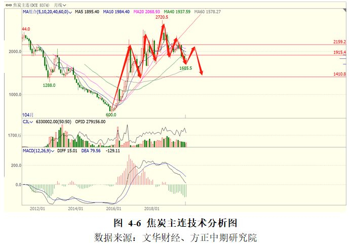 从月线图上看,焦炭主力已经完成5浪上涨,当前处于三浪下跌向四浪反弹走,期价在四浪反弹测试2150的压力位置之后,继续掉头向下,在跌破三浪低点之后将下跌至1410的重要支撑位置。