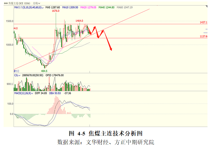 从焦煤月线走势看,当前焦煤主连处于三角线收敛阶段,当前三角形下趋势线有较强的支撑作用,在下趋势线支撑住之后,期价会向上测试1440压力位,压力位遇阻之后,期价掉头向下,跌破上升趋势线回踩1140关键支撑位,然后反弹至上升趋势线遇阻之后,继续掉头向下。