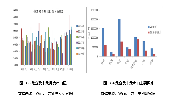 我国焦炭出口于东北亚(日本、韩国)、东南亚(印度、马来西亚、泰国、菲律宾)、南亚、南美洲以及非洲等国家和地区,其中日本、韩国、印度、印尼、马来西亚、巴西和南非是我国主要出口的国家。2019年印度、日本、巴西等国受经济下滑影响,钢铁行业发展回落,焦炭进口意愿降低,在一定程度上抑制了我国的焦炭出口。1-9月我国出口日本焦炭62.35万吨,同比下降42.99%,出口印度79.64万吨,同比下降47.86%,出口巴西31.92万吨,同比下降37.11%。