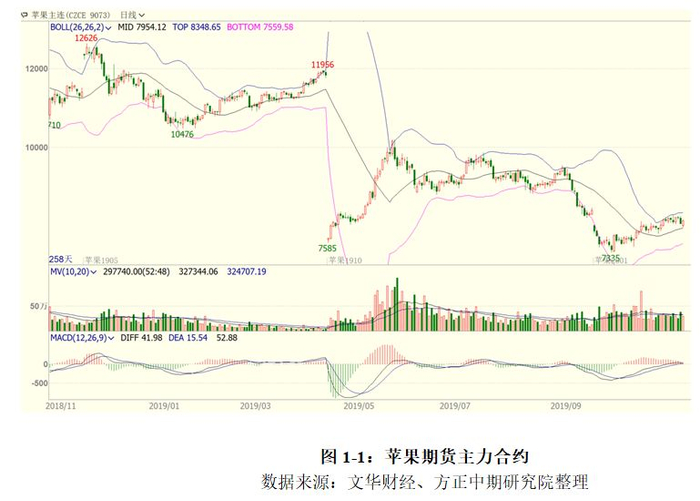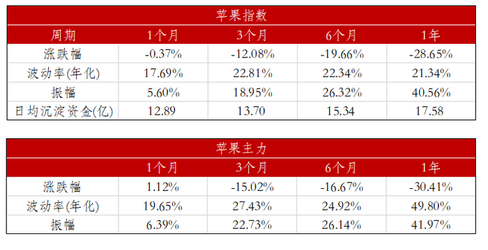 苹果作为期货而言是一个较新的上市品种,自2017年12月上市以来仅有两年的时间,苹果期货的参与度较成熟品种仍有一定的差距。由于今年苹果产量的大幅提升,近一年来苹果价格出现了较大下滑,至11月底苹果价格下跌28.65%,波动率为21.34%,振幅达到40.56%,日均沉淀资金达到17.58亿。