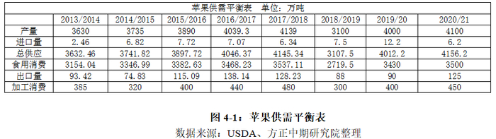 对于2020/21年度而言,由于目前我国苹果种植面积仍在不断增加,新的种植技术也在不断推广。国内苹果单产目前仅为17.54 吨/公顷,位列全球第27 位。未来中国引进新的栽培技术之后,国内苹果的产量还有大幅的上升空间。在这样的情况下,我们预计2020/21年度国内苹果产量将继续增长约100万吨,消费和出口也将同步增加。未来国内苹果随着产量的增加将进入供大于求的阶段,苹果价格在天气状况不发生较大问题的情况下将会不断震荡下行。
