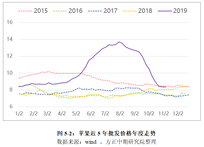 2019年国内苹果价格基本上分为两个阶段,这两个阶段不同的走势是由于2018年和2019年产量出现大幅变化所造成的结果。2018年国内苹果产量大幅下滑后,使得当年冷库的库存苹果数量急剧下滑,进而影响到整个2019年上半年的苹果供应,使得国内现货苹果价格从5月起开始不断上扬,一直上涨至8月为止。今年在天气没有发生较大问题的情况下,苹果产量出现了较大的恢复,基本接近2017年的水平。9月起国内苹果新果已经开始不断陆续上市,这使得现货市场承受了巨大的压力,苹果现货价格呈现出一路下滑的格局,至11月份苹果批发价格已经恢复到往年正常的水平。