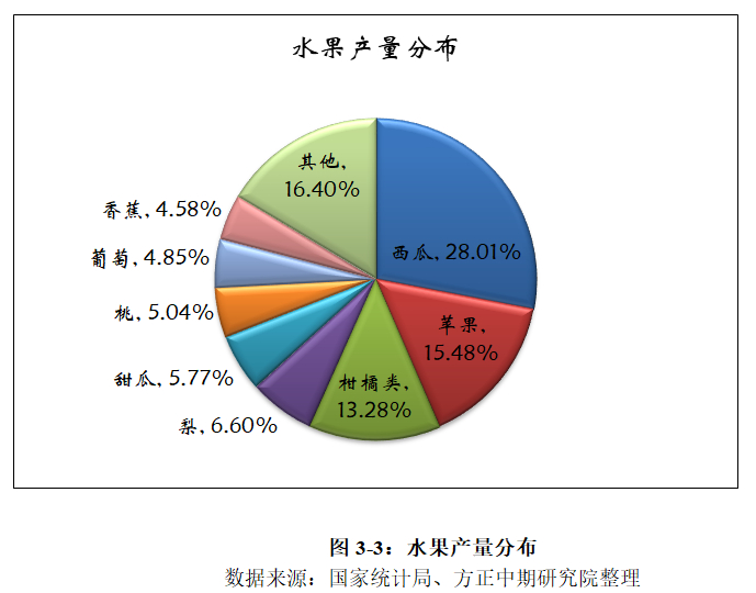 由于苹果非必需品的特点,对其消费的判断除了考虑自身的消费因素之外,还需要考虑整体水果市场以及其他水果对其消费的影响。整体水果市场阶段性供需情况也会影响苹果消费,主要是考虑阶段性时令水果与储存类水果的供需情况,今年上半年4-5月份由于时令水果偏少,同时储存类水果苹果等又出现了大面积减产,导致整体水果市场供应偏紧,对高价苹果的消费起到了促进作用,整体水果市场宽松还是偏紧对苹果的消费有重大影响。其次就是水果大类的影响,国家统计局数据显示,我国水果产量中西瓜的产量最高,其次是苹果、柑橘类、梨、甜瓜、桃、葡萄、香蕉等,其中西瓜、苹果、柑橘类占我国水果产量的57%,那么西瓜、柑橘类、梨等水果对于苹果消费的影响也非常大,不过由于西瓜集中上市时间为夏季,因此西瓜主要对苹果销售尾期影响较大,而柑橘类和梨上市时间与苹果接近,柑橘类和梨对苹果消费影响较大。下半年柑橘类和梨的供需情况对于苹果的消费影响较大,由于今年全国区域内天气表现良好,秋季柑橘类水果的上市使得苹果现货价格仍然承受了较大的压力,11月份现货苹果价格始终处于较低的水平。