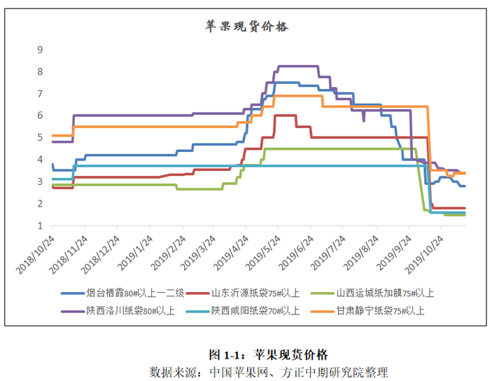 新季苹果开始逐步上市,本年度由于天气并没有出现较大问题,使得苹果产量在今年出现了较大的恢复。苹果产量的提升使得现货市场价格不断下移,同时10月前富士苹果上市较少,冷库采购及备货尚未大量开始,下游贸易商仍处于观望为主,市场对未来供货增加的预期使得苹果价格不断下滑。虽然10月西部晚熟红富士因连续降雨造成了上市的延误,但整体产量的上升仍使得价格承受了较大的压力。