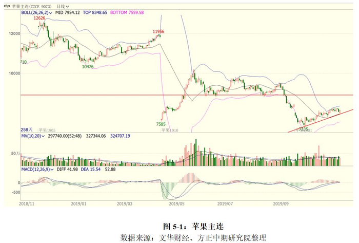 进入9月后产区苹果开始大量上市,现货价格的快速下行推动了苹果盘面主力合约1910的大幅下滑,盘面价格从9月面开始快速下落,3周的时间从9000元/吨最低下滑至7447元/吨的位置。但是西部产区在9月出现了连续的降雨,从而使得晚熟富士的上市时间有所推延,这造成了苹果盘面近远合约的走势出现了不同,由于缺乏人力的筛捡,使得10月交割合约上难以生成足够可以交割的仓单,这推动了苹果2010合约在交割月的大幅上行,从9月26日开始至到期日,1910合约从7500元/吨上涨至9700元/吨。